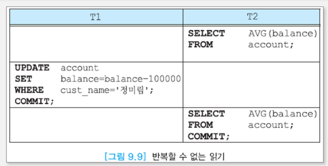위 스케줄표같은 경우는 T2가 동일한 읽기 연산을 여러 번 수행할 때 매번 서로 다른 값을 보게 될 수 있어.