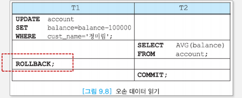 T2가 SELECT를 완전히 COMMIT하기 전에 T1에서 ROLLBACK을 해버리면 T2는 완료되지 않은 트랜잭션이 갱신한 데이터, 즉 틀린 데이터를 읽게 돼.