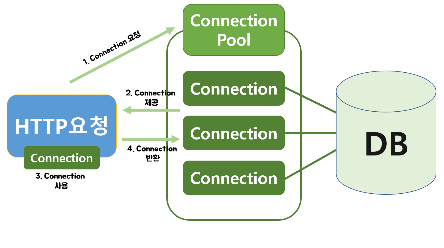 2. HTTP 요청에 따라 pool에서 connection객체를 가져다 쓰고 반환