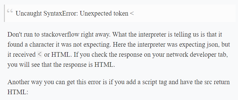 결국 자바스크립트를 include 하는 부분에서 js를 리턴해야하는데 html을 리턴하기 때문에 SyntaxError가 난것이었어.